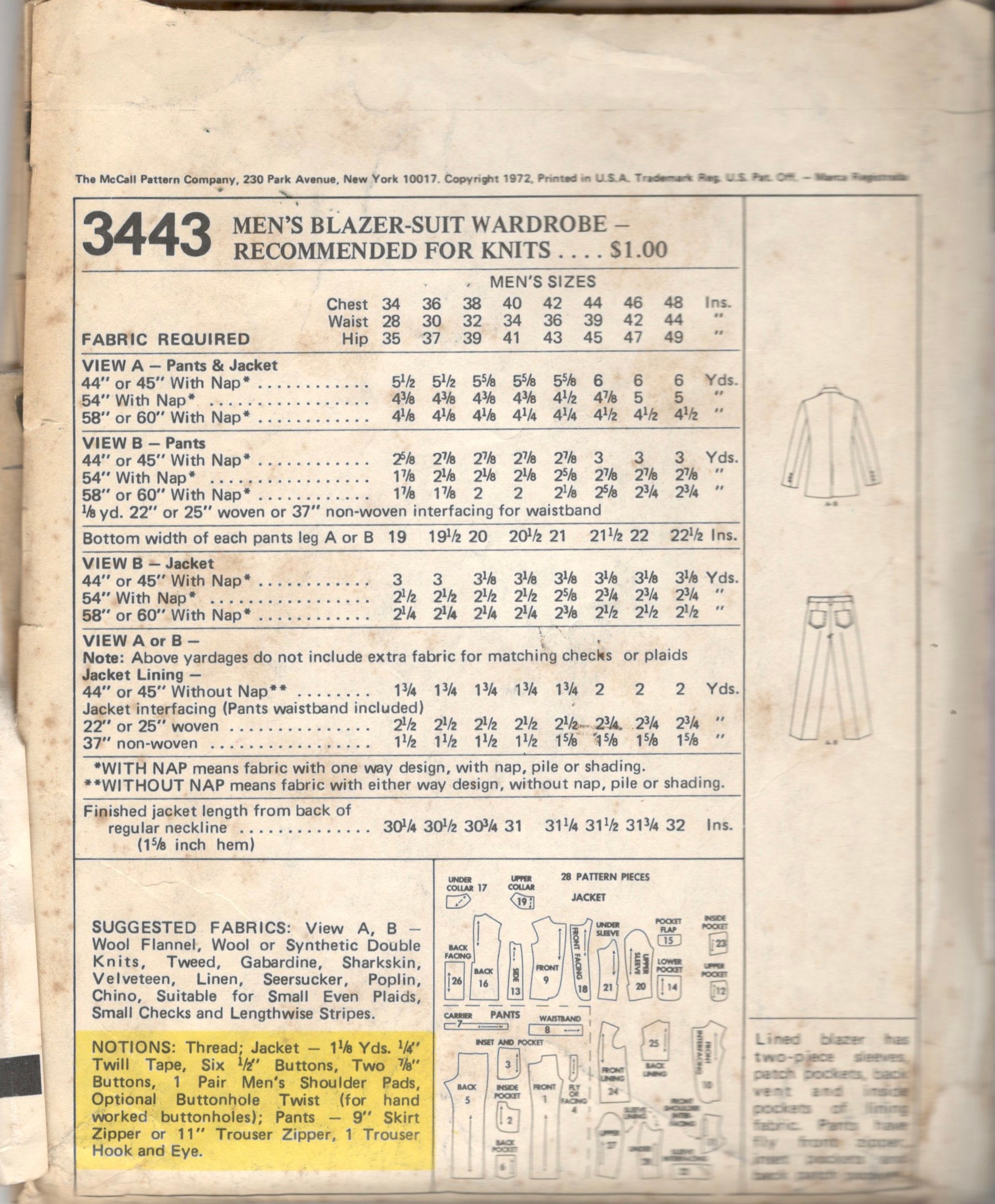 Mccalls 3443 1970s Mens Suit Pattern Pants And Blazer Jacket Etsy